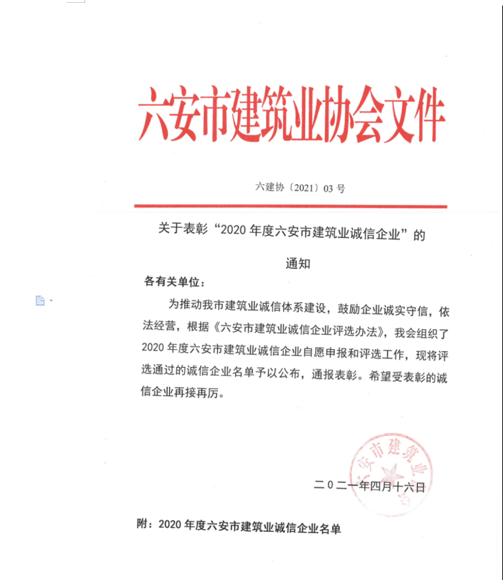 熱烈祝賀安徽啟初建筑公司榮獲:2020年度六安市建筑業誠信企業