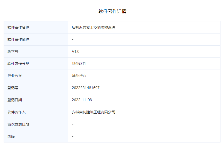 公司獲得軟件著作權-名稱:啟初返崗復工疫情防控系統