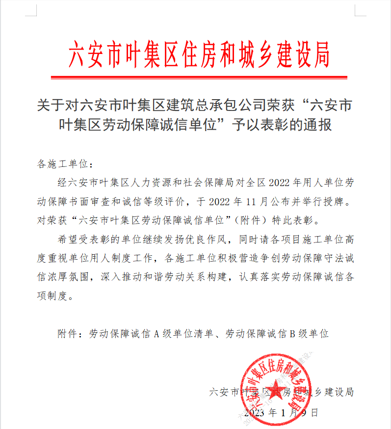 關于對六安市葉集區建筑公司榮獲“六安市葉集區勞動保障誠信單位”予以表彰的通報